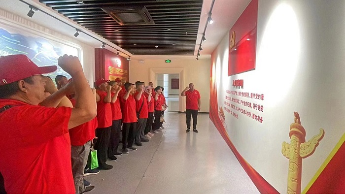 在紀(jì)念館內(nèi),黨員們面對鮮紅的黨旗,一起高舉右手,再次重溫入黨誓詞,鏗鏘恢宏的誓詞,使每一位黨員再次接受了心靈洗禮,銘記莊嚴(yán)承諾,牢記共產(chǎn)黨員的責(zé)任擔(dān)當(dāng)和光榮使命。